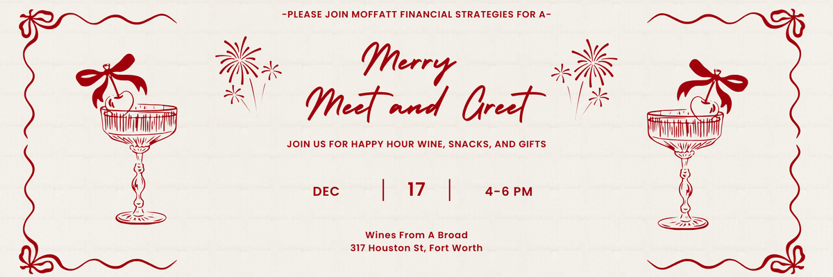 Moffatt Financial Strategies invites you to join us for a Merry Meet and Greet! Whether you're new to the firm or you've been with us forever, we'd love to see you and introduce you to our newest team members, Nathan and Bonnie. The rest of the team will be there celebrating too! Join us for wine (and non-alcoholic options), grazing boards and even your choice of a gift from us. Whether you stay for a minute or an hour, we'll be so glad to see you!